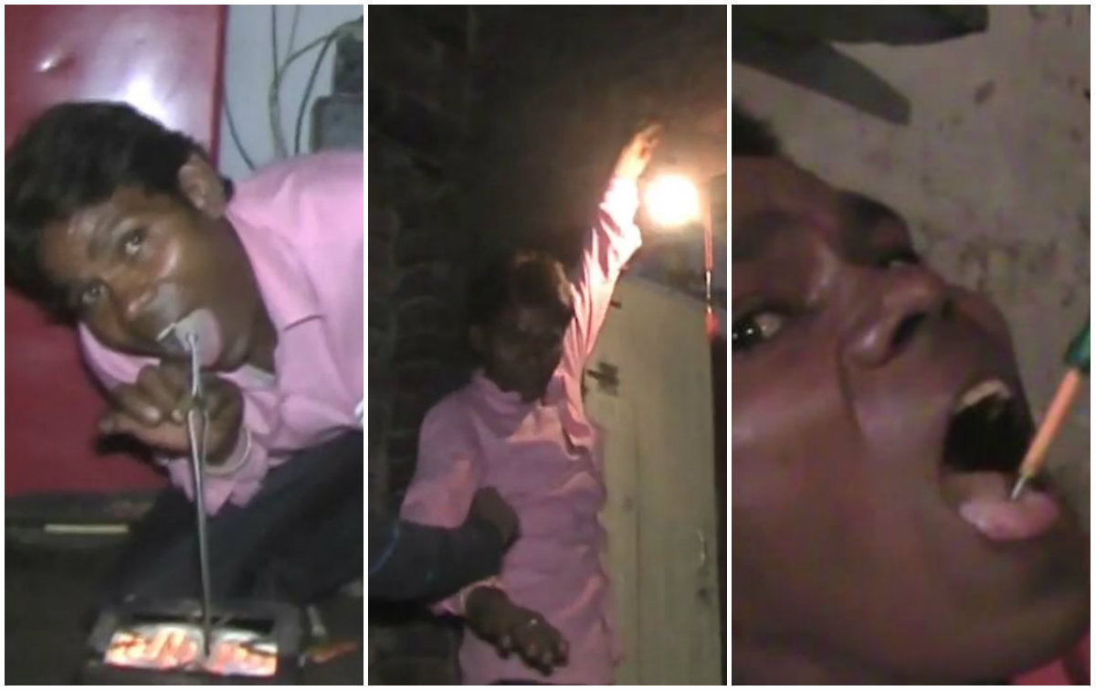 Em um deles, o indiano coloca a mão em um fio e na outra ponta uma chave de fenda medidora de corrente elétrica.
